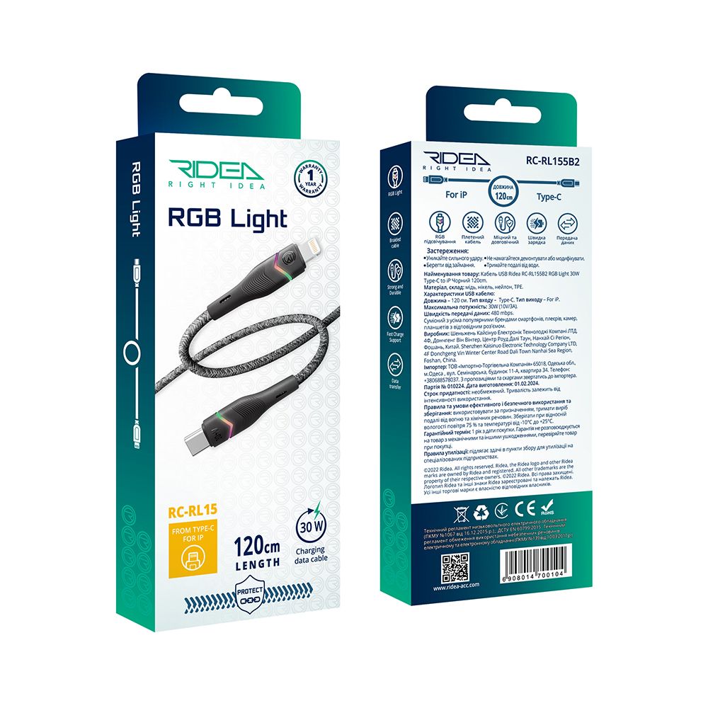 Кабель USB Ridea RC-RL15 RGB Light Type-C to Lightning 30W 1.2m (Чорний)