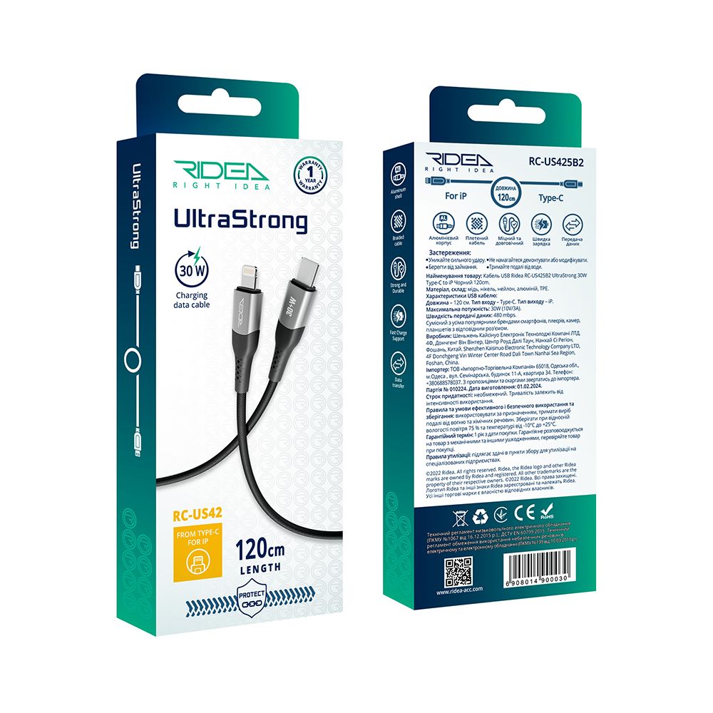 Кабель USB Ridea RC-US42 UltraStrong Type-C to Lightning 30W 1.2m (Чорний)