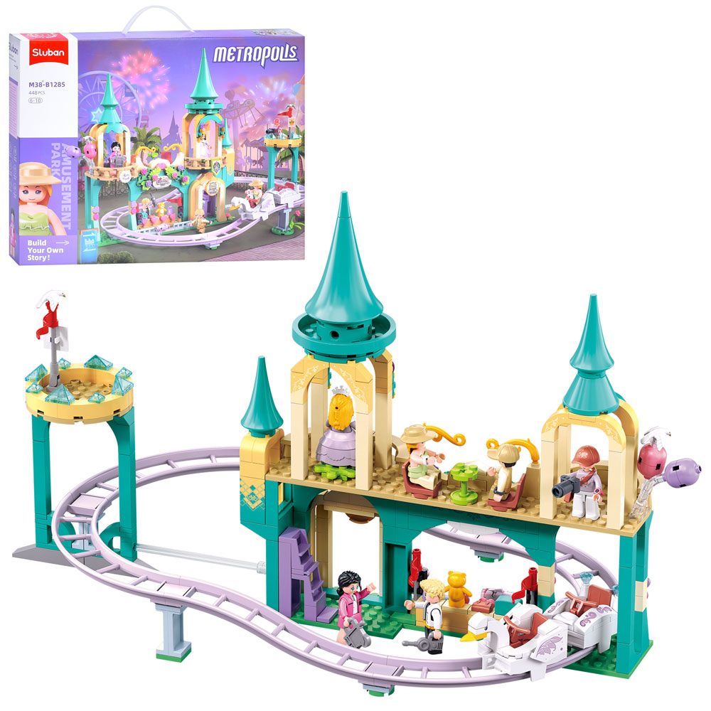 Конструктор SLUBAN M38-B1285 рожева серія, парк розваг, дорога, фігурки, 448 дет., кор., 42,5-33-7см