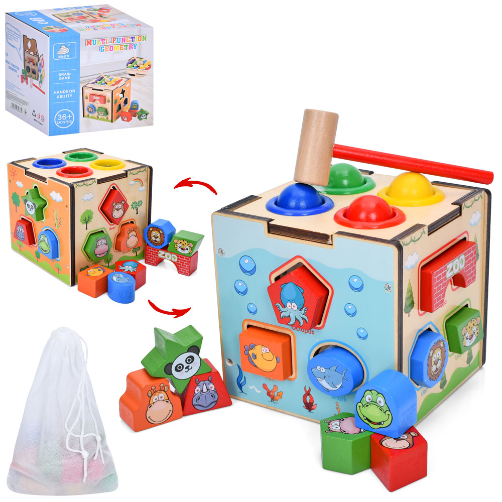 Дерев'яна іграшка Центр розвиваючий MD 0828 куб,сортер,фігури 12шт.,стукалка,кульки 4шт,молоток,кор.