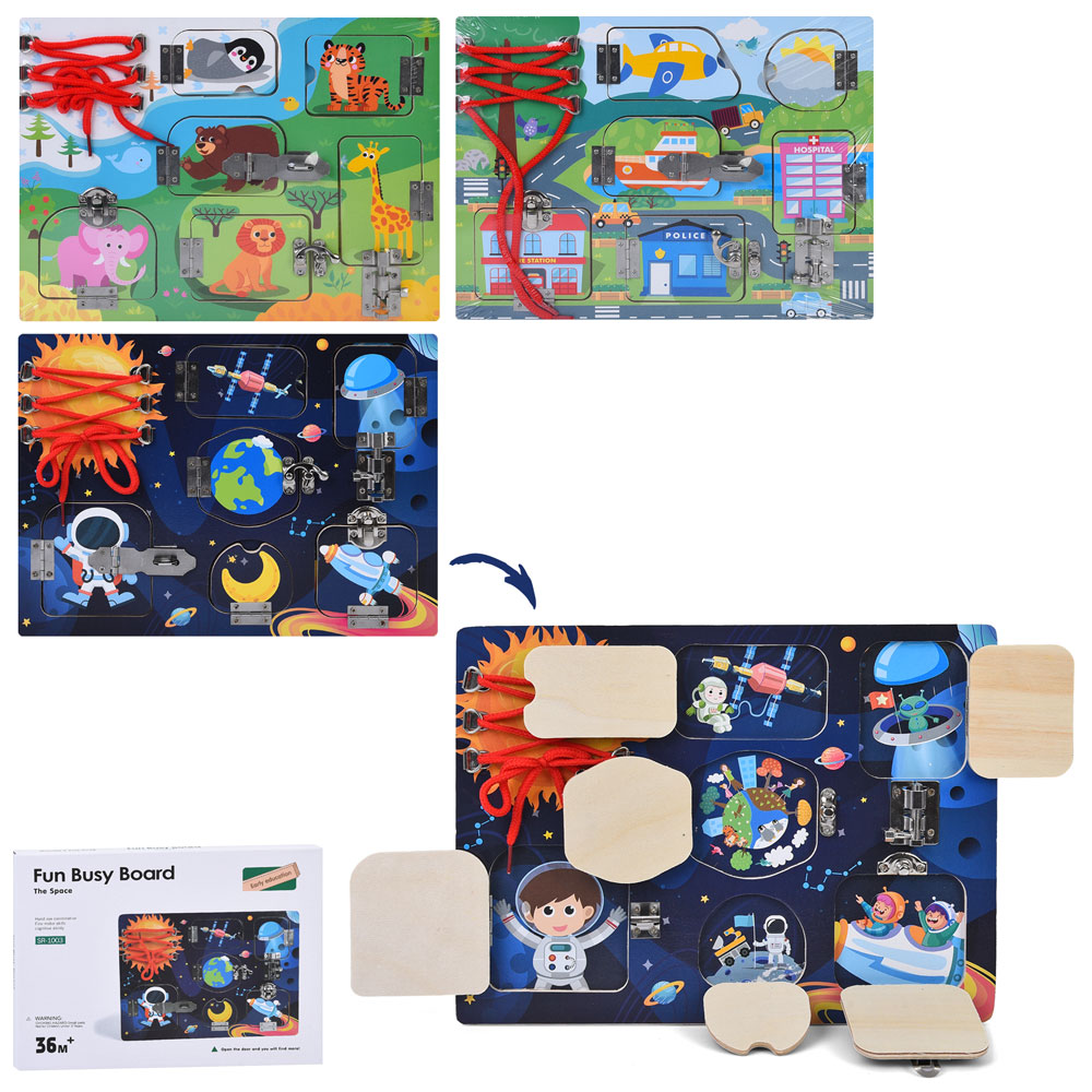 Дерев'яна іграшка Бізіборд MD 0146 ігрове поле 30-22,5см,шнурівка,замки/засуви(метал),рух.дет.,3види