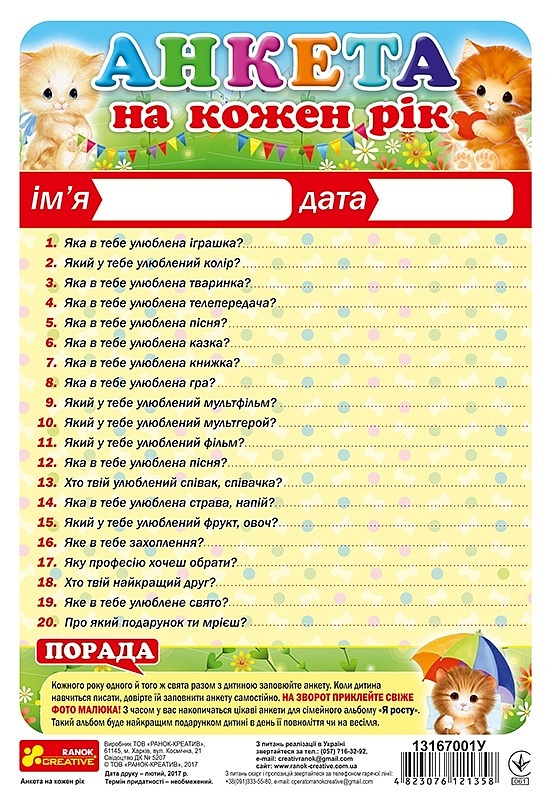 Кожного року одного й того ж свята разом з дитиною заповнюйте анкету.Коли дитина навчиться писати,довірте їй заповнити анкету самостійно.З часом у вас накопичаться цікаві анкети для сімейного альбому.Такий альбом буде найкращим подарунком дитині в день її повноліття чи на весілля.