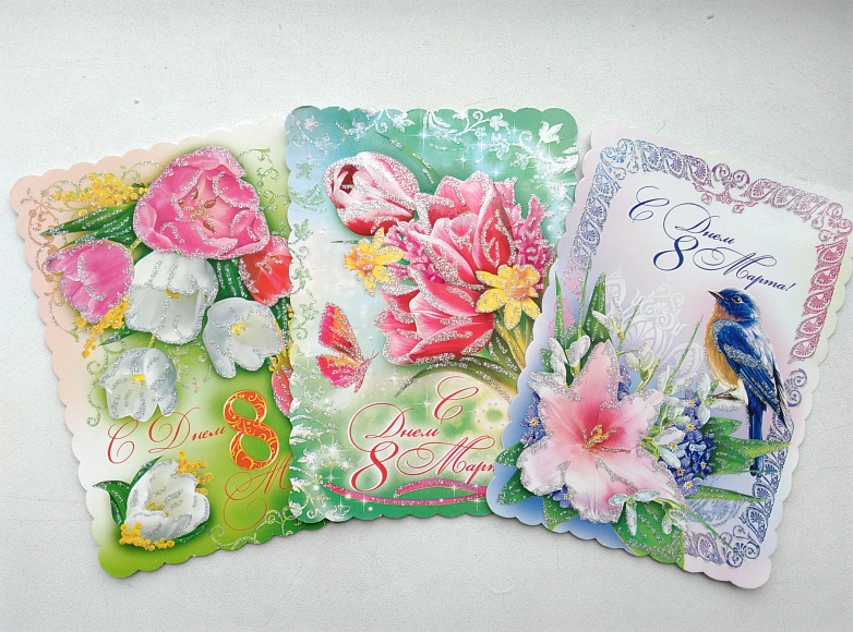 Листівка вітальна до дня 8 березня, з присипкою - двохстороння, з текстом.Мова: російська.