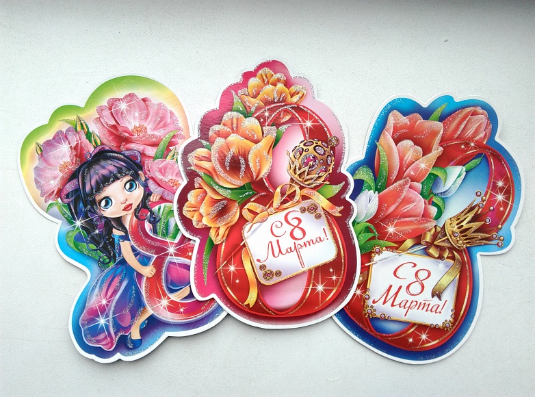 Листівка вітальна до дня 8 березня, з присипкою - двохстороння, з текстом.Мова: російська.