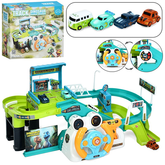 Опис Автотренажер T917A кермо, трек/гараж, машинки, муз., бат., кор., 30-27-12,5 см.