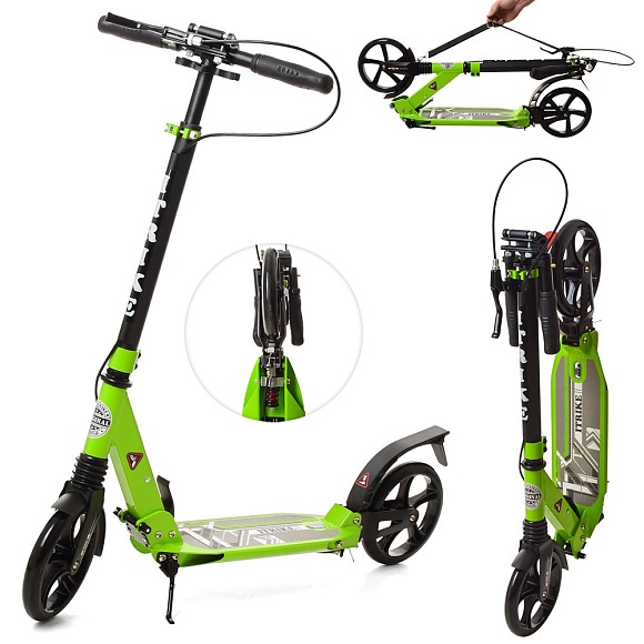 Опис Самокат sr 2-018-9-gr доросл.,алюм.,кол.2шт.ПУ200мм.,ручне гальмо,замок,зелений,кор.