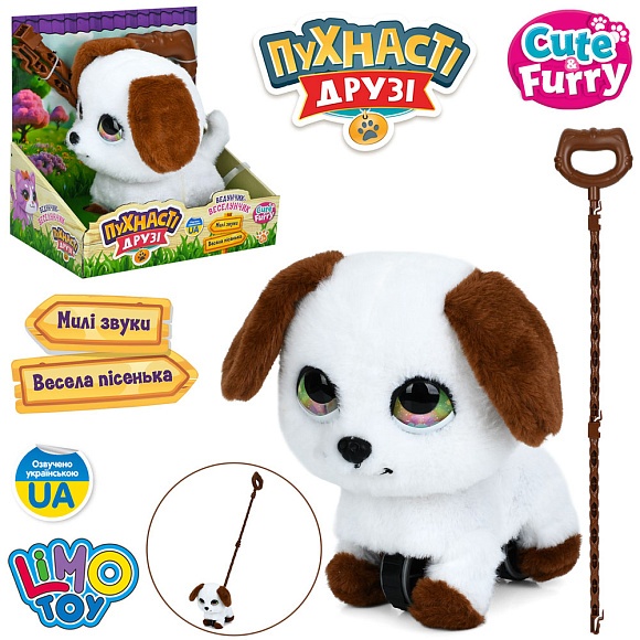 Опис Тварина m 6247 i ua собака,19см, каталка на палці(65см), муз.(укр), пісня, звук,плюш,на бат.,в кор.