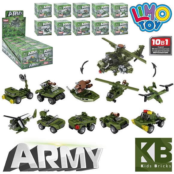 Опис Конструктор kb 2020 військовий транспорт, 10в1, від 28 дет.,кор.,10шт.(10 видів)в диспл.,24-14,5-8см