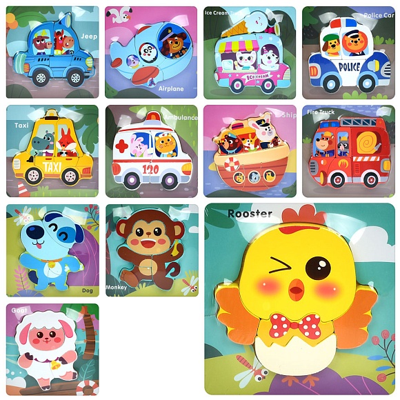 Дерев'яна іграшка Пазли MD 1984 12 видів (транспорт, тварина), кул., 15-15-1,5 см.