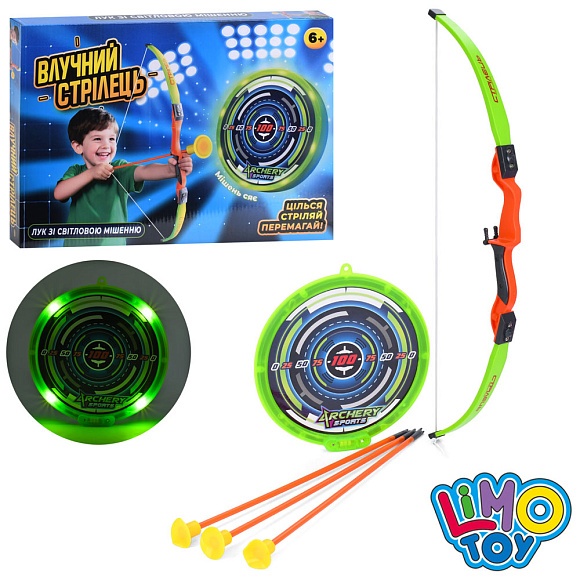 Лук MR 1562 56см, стріли-присоски 41см 3шт, мішень(23,5см, світло, бат(табл), в кор-ці,37-25,5-4,5см