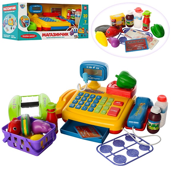 Опис Касовий апарат 7018-ua 25см, калькулятор,мікрофон,сканер, ваги,звук(укр),світло,гроші,бат.,кор.