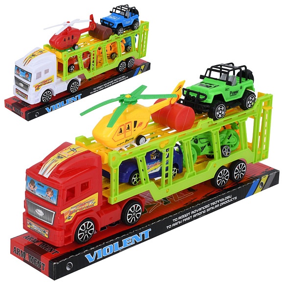 Опис Трейлер 738-23 (36шт) інерція, 32см,вертоліт,машинка2шт,мотоцикл2ш,мікс кольорів,у слюді,345-15-7см