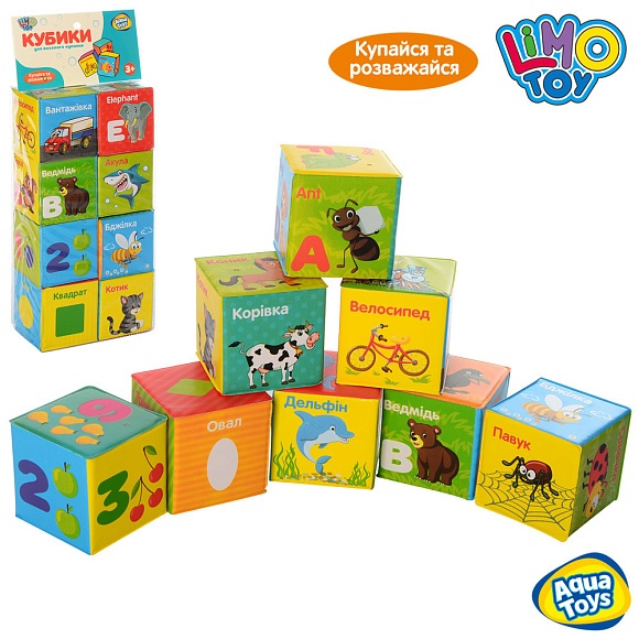 Опис Кубики m 5465 ua для купання, 8 шт., азбука (укр.), цифри, тварини, кул., 16-38-7 см.