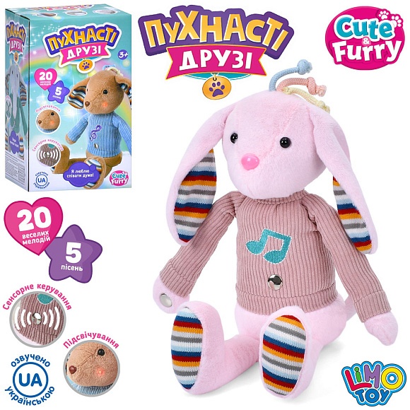 Опис Тварина m 5994 i ua зайчик, сенсорний, плюш,, муз., пісні (укр, англ), світло, бат.,15-25-12 см.