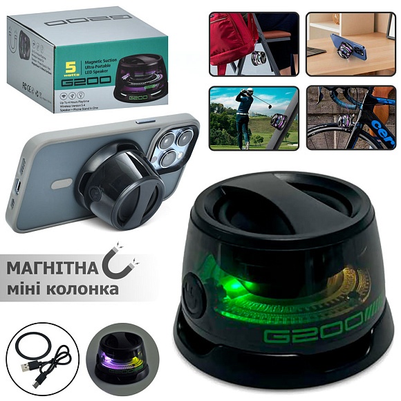 Опис Колонка g200 бездротова, портативна, магнитна, акум., bТ, usb, світло, кор., 8,5-8-5 см.