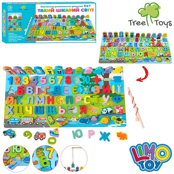 Опис Дерев'яна іграшка Багатофункціональна дощечка md 1927 (20шт) азбука-укр,цифри,транспорт,тварини,кор-ці, 46-23-3см