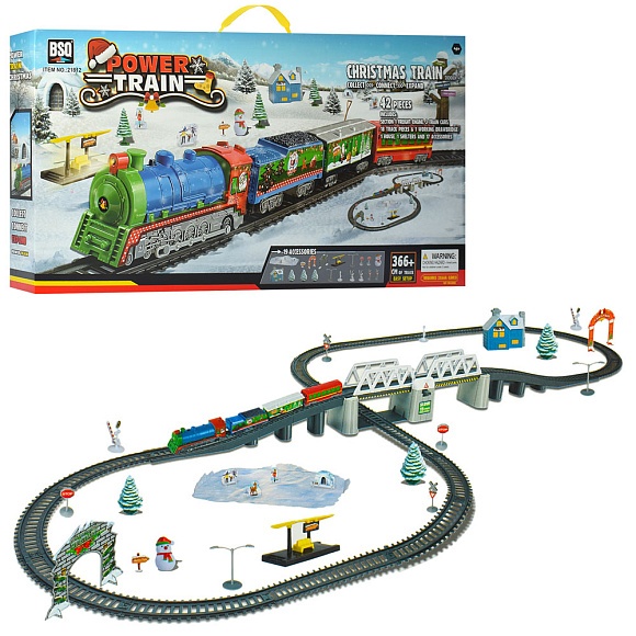 Залізниця 21812 локомотив, вагон 3 шт., вокзал, сніговик, світло, бат., кор., 59-31,5-8 см.