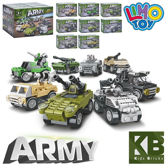 Опис Конструктор KB 2002 військова техніка, інерц., від 45 дет., 16 шт. (8 видів) в диспл., 30-20-17 см.