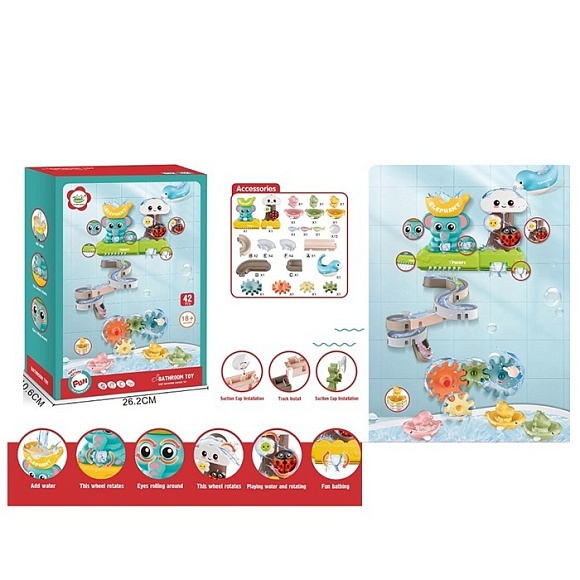 Опис Гра для купання 6688-918 (8шт) водоспад, слон, хмаринка, лабіринт, присоски, динозаври, морські мешканці, 42дет, в кор-ці, 26-36,5-10,5см