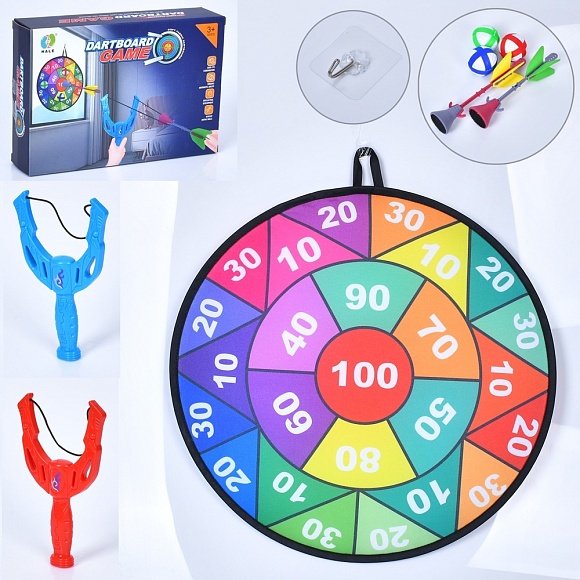 Опис Дартс MR 1491 на липучці, рогатка, дротики 2 шт., м'ячі 3 шт., 2 кольори, кор., 26-18-6 см.