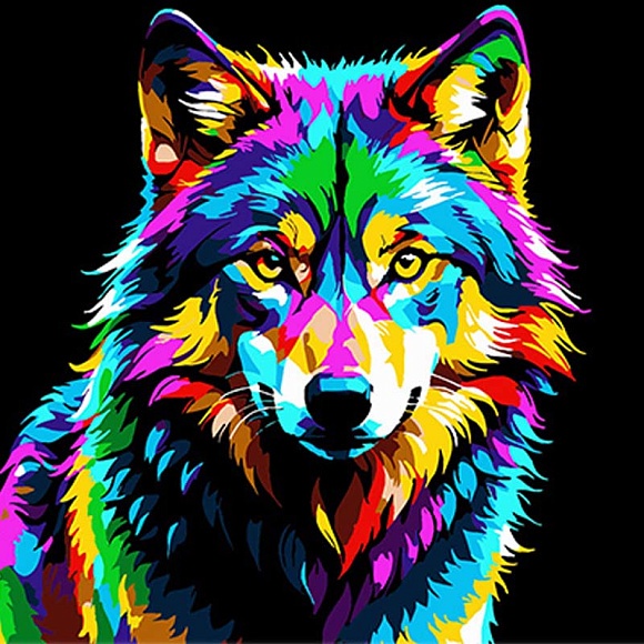 Опис Картина за номерами Strateg ПРЕМІУМ Барвистий вовк на чорному фоні розміром 30х30 см (SH3030-4)