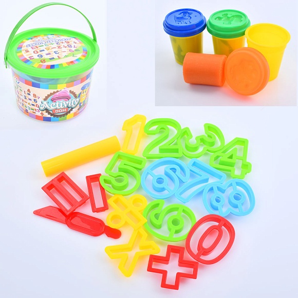 Тісто для ліплення MK 5310 3кольори(баноч.з кришкою),аром.,формочки-цифри,інструм.,відро,10-14-14см