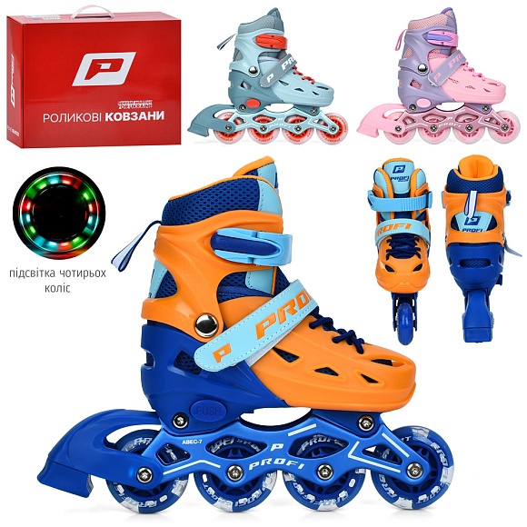 Ролики A4153-S (31-34) розсув.,шнур.+бакля,алюм.рама,ABEC-7,кол.ПУ64мм,3кольори,уст.18см,світло,кор.