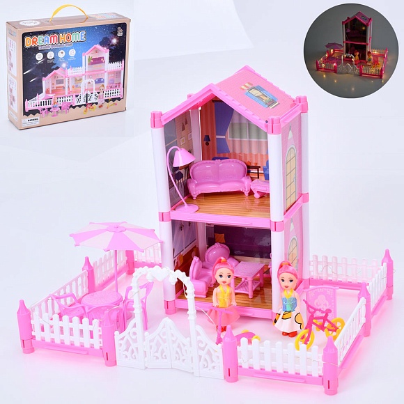 Опис Будиночок sh99-2 2 поверхи, меблі, лялька 2 шт., 88 дет., світло, бат.(таб.), кор., 30-25-8 см.