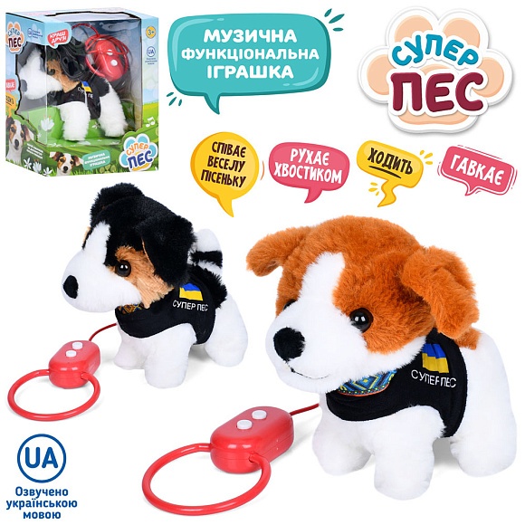 Опис Собака M 5834 I UA дист.кер.(повідець),ходить,рух.хвостом,плюш,2 кольори,муз.(укр.)-пісня,бат.,кор.