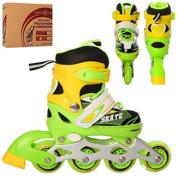 Опис Ролики a 4123-xs-gr(27-30) розсув,шнур+бакля,ал.рама,колПУ64мм,1світ,зелений,комбо,кор.35-27,5-10см.