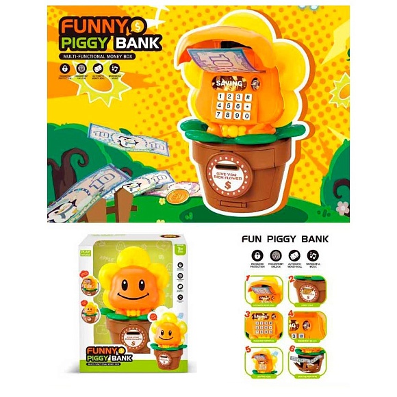 Опис Банківський термінал 1111-149 квітка у горщику,скарбничка,сейф з кодом,відб.затягує купюри.муз.світ.