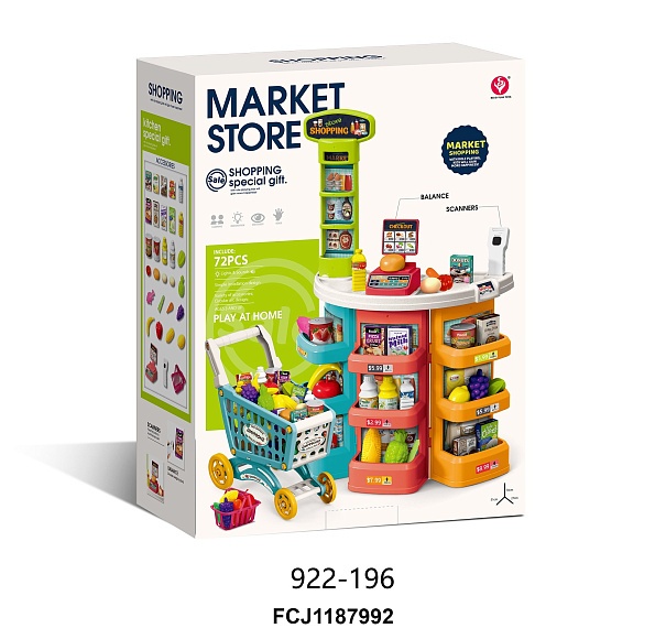 Опис Магазин 922-196 прилавок, сканер, продукти, візок, 76 пред., муз., світло, бат., кор., 46-61-19 см.
