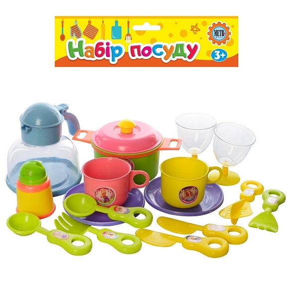 Посуд 977 №1 чайник, чашки 2 шт, блюдця 2 шт, сковорідка, столові прилади, кул., 19,5-24-9,5 см.