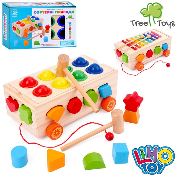 Опис Дерев'яна іграшка Центр розвиваючий MD 0833 каталка(на шнурі),сортер,фігурки,2види,кор.,24,5-16-9,5с