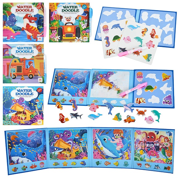 Книжка для малювання INT 0025 для малювання водою, маркер для води, картинки з липучками,4 види,кул.
