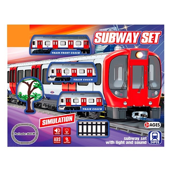 Опис Залізниця JHX5916 локомотив, 2 вагони, дорожні знаки, 24 дет., муз., світло, бат., 45,5-35,5-6,5см.