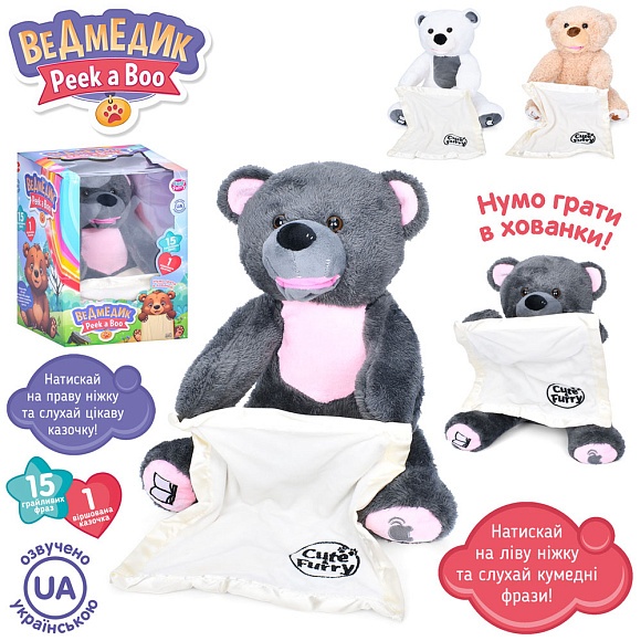 Опис Тварина m 5843 i ua ведмідь, укр. казка, гра в хованки, рухл., 3 види, муз., бат., кор.,19-27,5-19см