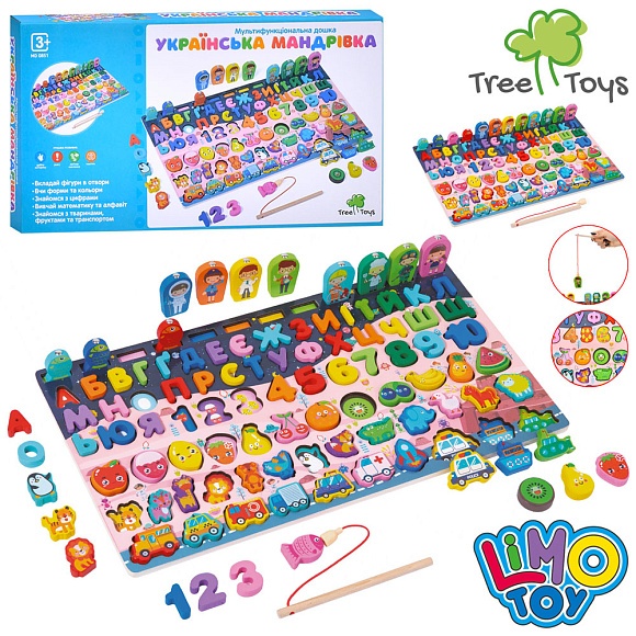 Опис Дерев'яна іграшка Багатофункціональна дошка md 0851 абетка(укр.),цифри,тварини,трансп.,фрукти,рибол.