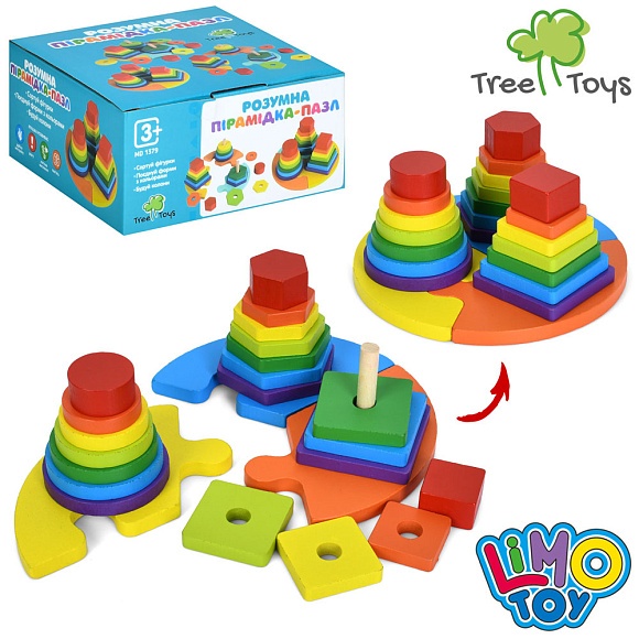 Опис Дерев’яна іграшка Геометрика MD 1379 ігрове поле-пазл, пірамідка 3 шт., 24 дет., кор., 17-17-8,5 см.