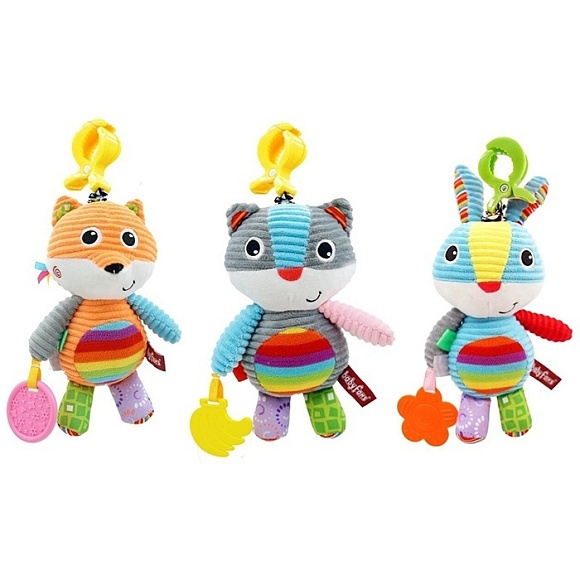 Опис Підвіска м'яка bf2431-3-4 тварина, прорізувач, розтяжка, брязкальце, 3 види, муз., кул., 21-25-7 см.