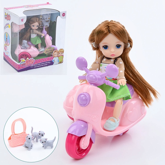 Опис Лялька 91068-a шарнірна, мотоцикл, сумка, кіт 3 шт., кор., 17-18-11 см.