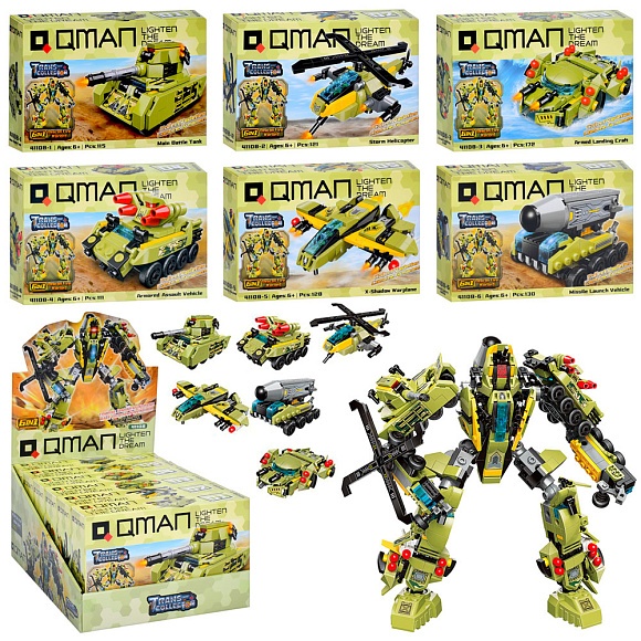Конструктор Qman 41108 військовий,транспорт,від 111дет,6видів,кор.,6в1(робот),6шт. в диспл.,33-28-14