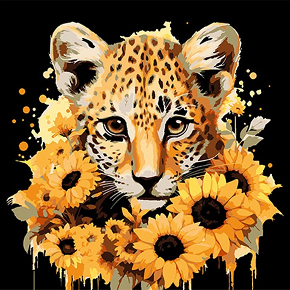 Опис Картина за номерами Strateg ПРЕМІУМ Леопард та золоті соняшники на чорному фоні розміром 30х30 см (S