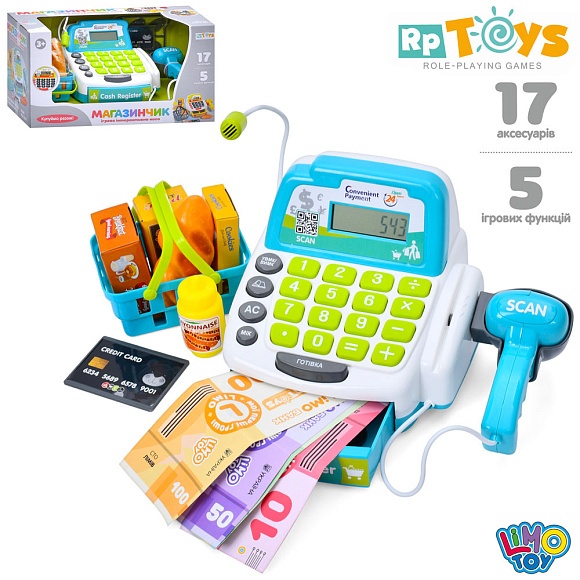 Опис Касовий апарат M 4391 мікрофон, калькулятор, сканер, продукти, муз., світло, бат., кор.,34,5-18-18см