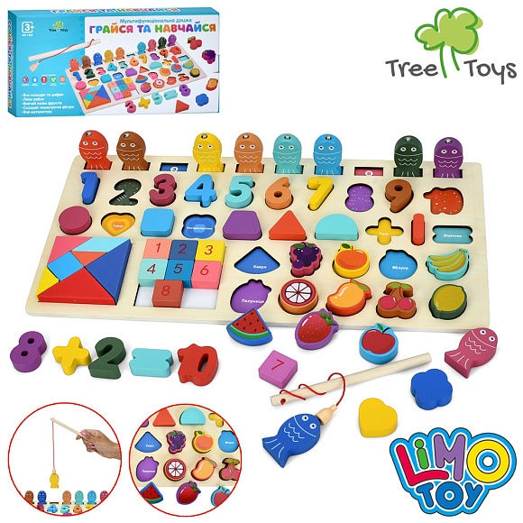 Опис Дерев’яна іграшка Багатофункціональна дошка md 1369 цифри,риболов.магн.,п'ятнашки,танграм,фрукти,кор