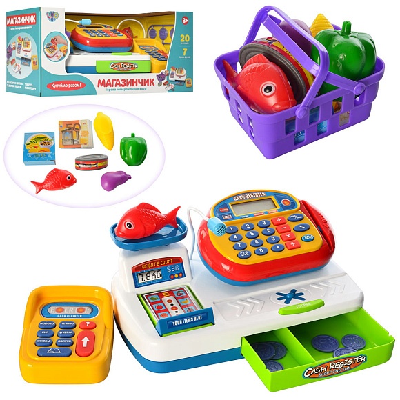 Опис Касовий апарат 7019 ua калькулятор, продукти, монети, муз.(укр.), світло, бат., кор., 43-18-18 см.