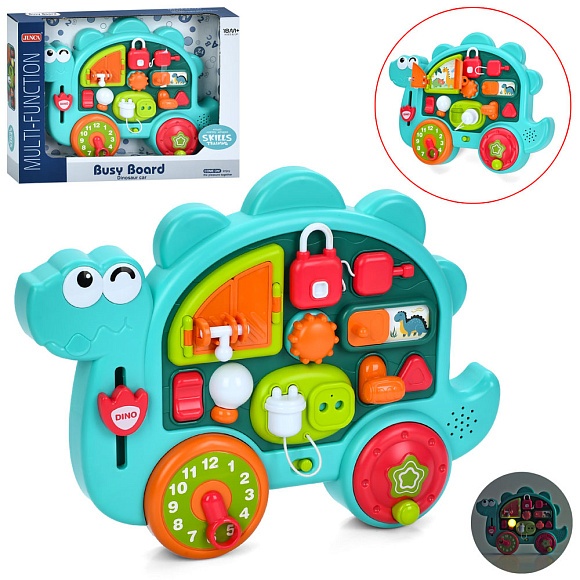Опис Гра RJ6825 динозавр,бізіборд,,годин.,розетка+вилка,замок+ключ,рух.дет.,муз.,світло,бат.,кор.,37-27,5
