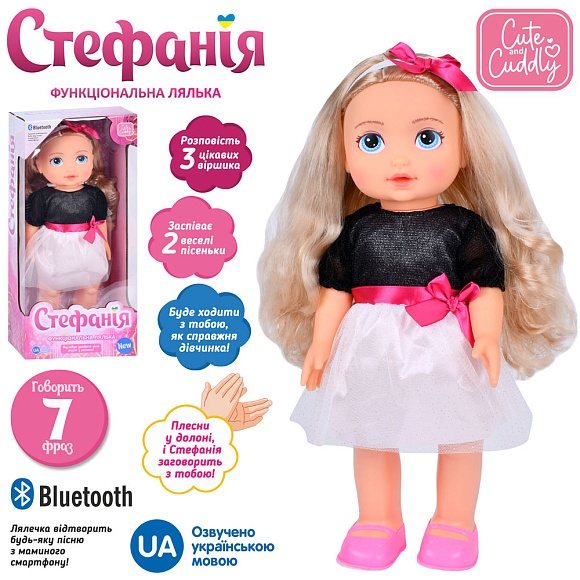 Опис Лялька m 5910 i ua Стефанія, пісня, ходить, bТ, реагує на хлопок, муз.(укр), бат.,кор.,20,5-43-12см.