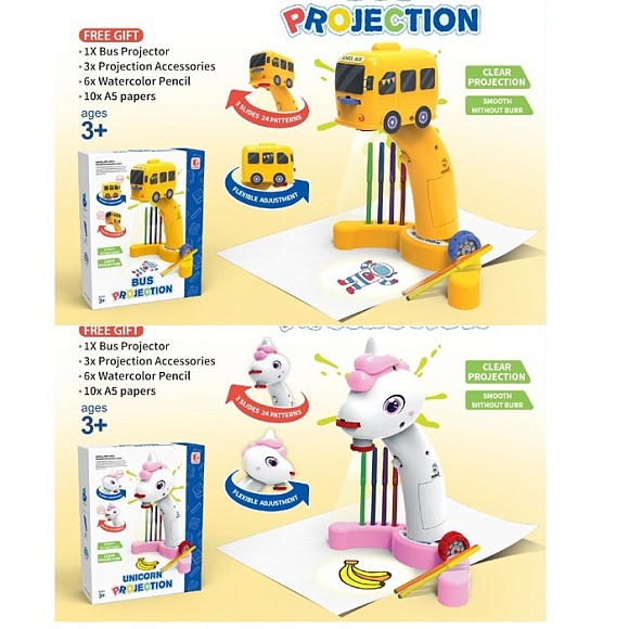 Проектор 6658-6659 слайди/24картинки,бумага,фломастери 6шт,,світло,на бат.,2 види(єдиноріг, автобус)