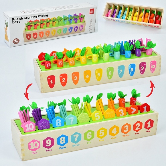 Опис Дерев'яна іграшка Центр розвиваючий MD 0736 город(морква-різнокольор.з цифр.),палички для лічби,кор.